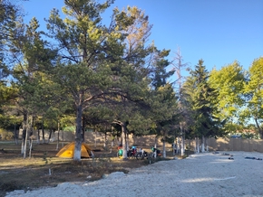 Nous cherchons un endroit pour nous poser, pas la peine de poursuivre. Nous trouvons une sorte de parking abandonné jouxtant un hôtel / restaurant. Nous montons la tente à deux mètres du lac à l’ombre des pins.