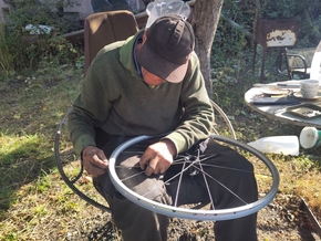 Une fois de retour avec une nouvelle jante, Grigor remet en place le moyeu et les rayons, j’ai l’impression de voir ma mère re-canner les vieilles chaises.