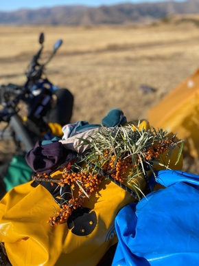 Ce beau lac est également pour nous l’occasion de découvrir les argousiers en fruit. Ils sont partout et les commerçants du coin les vendent en un jus délicieux. Nous ramassons les baies acidulées et légèrement âpres de cet arbuste épineux et nous en délectons.