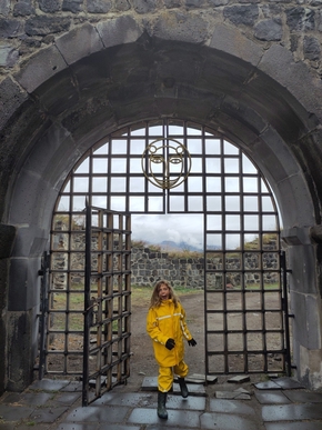 Le lendemain matin, nous faisons le grand détour par la route pour aller visiter les ruines de la belle forteresse. Enserrée par deux profonds canyons, elle est impressionnante. Puis nous retournons à Ստեփանավան (Stepanavan) pour notre traditionnel restaurant de fin d’Arménie. Nous mangeons à côté d’une belle bibliothèque et le patron nous laisse partir avec un vieux livre qui contient des extraits de littérature française, parfait !