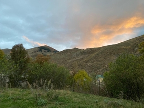 Nous aimerions arriver au bout de la côte mais ça ne va pas le faire. Estelle met en route son outil low-tech pour nous dégotter un endroit agréable pour dormir. La rencontre avec Arsen est d’une simplicité déconcertante, malgré la barrière de la langue, et nous voilà posés dans un pré à l’écart de la route avec même un abris pour nous asseoir et manger.