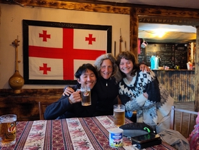 En redescendant, nous avons la bonne surprise de retrouver Ira, une jeune femme russe que nous avions rencontrée à მარტვილი (Martvili). Les retrouvailles sont joyeuses. Elle habite désormais თბილისი (Tbilisi) où elle travaille dans un café. Elle parcourt la Géorgie avec sa tente et son sac-à-dos dès qu’elle le peut. Elle est accompagnée par Sen, un ami japonais vivant à Amsterdam. Nous partagerons le repas du soir avec eux avec grand plaisir dans “notre” restaurant.