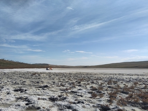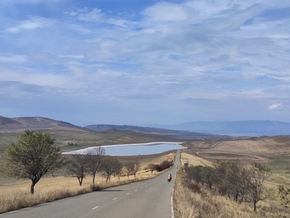 Au sommet, nous pouvons voir au loin les grandes villes alentours comme თბილისი (Tbilisi) ou რუსთავი (Rustavi) et ses cheminées d’usines. De l’autre côté de la montagne, nous plongeons vers un lac à la couleur étrange. Nous posons les vélos et nous rapprochons du lac. Il est salé ! Le sel blanchit la boue plus ou moins séchée. Ça craque quand on marche. La mer venait jusqu’ici il y a bien longtemps…