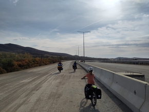 La matin nous permet de finir le chemin qui nous mène au pied d’un chantier d’autoroute. Les camions passent à toute vitesse dans le chemin poussiéreux que nous sommes sensés emprunter. Une voiture anglophone s’arrête et nous indique qu’il vaut bien mieux monter sur la route en construction, elle nous mènera à bon port. Alors, nous montons sur cette autoroute totalement vide mais déjà asphaltée. C’est très plaisant cette piste cyclable de luxe. Nous roulons sur la voie de gauche, Léon et moi zigzaguons même juste pour le plaisir.