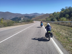 Je ne m’attendais pas à descendre autant ! Nous sommes dans un défilé de montagnes au milieu des bois, nous traversons de petits villages charmants. Je me réjouis de faire la route dans ce sens. Elle est bien calme la route et cela ajoute à son charme.