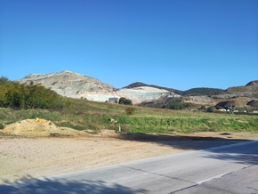 Le lendemain, notre itinéraire nous fait passer à côté de la mine d’or de საყდრისი (Sakdrisi), la route et ses alentours sont couverts de poussière et les gros camions roulent vite. Beaucoup de noyers bordant la route sont morts ou en mauvais point.