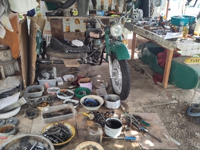 Nous nous arrêtons sur un parking, je demande aux gens où je pourrais trouver un soudeur pour le réchaud. Un taxi s’arrête, Giorgi en sort et nous interroge sur notre voyage, il est ébahi. Il voit que je peine avec mon étendage et m’embarque dans son taxi, m’emmène chez lui. Passionné de mécanique, il retape une belle vieille moto et son sidecar, son atelier me fait penser à mon oncle Pierre qui partage également cette passion. Nous trouvons un tasseau de bois. Je parle un peu italien avec sa femme qui le parle bien mieux que moi, inattendu !