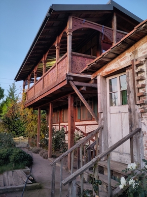 Nous rencontrons également Isabelle, la femme de Giorgi qui est souvent absente du domaine. Elle est Suisse et vit ici depuis fort longtemps. Elle m’explique un peu plus en détail la construction de leur cuvage. Bâti en employant des méthodes traditionnelles et des matériaux sains, il dénote dans le milieu du vin géorgien où les constructions modernes sont réalisées au ciment. Elle me dit que ce cuvage a été construit comme une église, pour durer. Tout est fait à la chaux, la ventilation naturelle a été pensée pour l’hiver et l’été, le sol du cuvage n’a pas de dalle pour laisser respirer les qvevris.