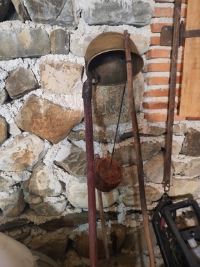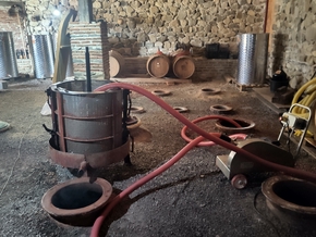 Lorsque le processus de vinification est terminé, le vin est transféré dans un autre qvevri et le raisin doucement pressé. Le transfert se fait à l’aide d’une pompe. Une première partie du liquide est transférée directement. Puis on mélange le liquide et le raisin qui vont passer par le petit pressoir. Mais la pompe ne peut pas tout faire, alors on utilise une grande louche en cuivre avec un long manche pour aller au fond, puis un petit récipient manipulé comme un marionnettiste pour aller chercher les dernières goutes. Notre cuve se fait en 4 passages par le pressoir et je remarque qu’on ne presse pas trop fort le raisin. C’est le premier jus, le meilleur, que l’on souhaite utiliser pour le vin, le reste va dans une grande cuve inox, mélangé avec d’autres raisins pressés plus tôt et sera distillé sur place dans les jours qui viennent.