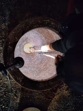 Durant les quelques jours où nous resterons ici, nous pourrons donner un coup de main. J’ai l’occasion notamment de participer à une presse. La vinification géorgienne traditionnelle se fait dans des qvevris. Ces sortes de grandes amphores en terre cuite et enrobées d’un enduit à la chaux sont enterrés dans le cuvage. Le raisin foulé y est mis, grappe entière, à fermenter. Le raisin est repoussé vers le fond et le qvevri est recouvert traditionnellement avec une pierre, désormais une vitre épaisse, scellée avec de l’argile type bentonite.