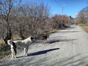 Après quelques jours, je décide de refaire le chemin dans l’autre sens et de remmener les chiens à Ananuri. Ils me suivent. Plus nous nous approchons d’Ananuri, plus Tango, la petite femelle qui sert de bras droit à Bernie, est pressée de rentrer. Elle me montre même un raccourcis que j’hésitais à prendre.