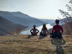 Puis il nous fait remonter un bon petit morceau. Nous pouvons ranger les gants. Pousser un peu les vélos sur ce chemin bien caillouteux. En haut de la côte, une vue imprenable sur le lac. Nous en profitons pour faire une pause contemplative…