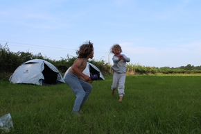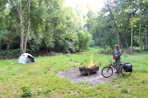 Une fin de journée où nous ne trouvons pas où dormir nous verra faire des allers retours désespérant de trouver rapidement un endroit où se poser pour les enfants qui commencent à en avoir marre et ont besoin de repos. Alors nous demanderons aux promeneurs dominicaux s’ils connaissent un lieu, une personne, jusqu’à trouver quelqu’un qui nous rejoigne après notre discussion à vélo et nous propose un jardin privé en bord de rivière. Il nous prendra gentiment nos téléphones pour les recharger et nous les livrera en début de soirée, remis à plein régime