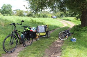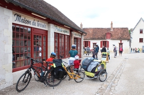 La configuration reste la même que l’année passée : Léon sur son vélo et 2 vélos adultes, un qui tire un vélo suiveur et une charrette et l’autre qui tire une charrette.